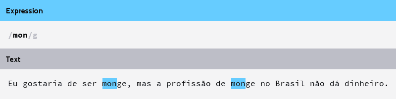 Outra coisa, uma regex pode ser formada por múltiplos elementos, de modo que um trecho da string deve bater com a expressão regular inteira. A expressão monge só dá match com a string “monge”. Por exemplo, altere a expressão de monge para monges e veja o que acontece: